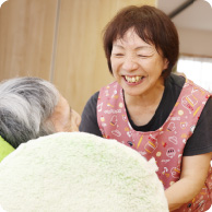 身の回りのお世話だけが私たちの役割ではありません。利用者さんと「感情を共有する」。例えば陽が差しこむテラスで一緒にゆっくりお茶を飲みながら会話を楽しむ。こうした「普通の時間」を私たちは大切にしています。