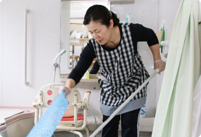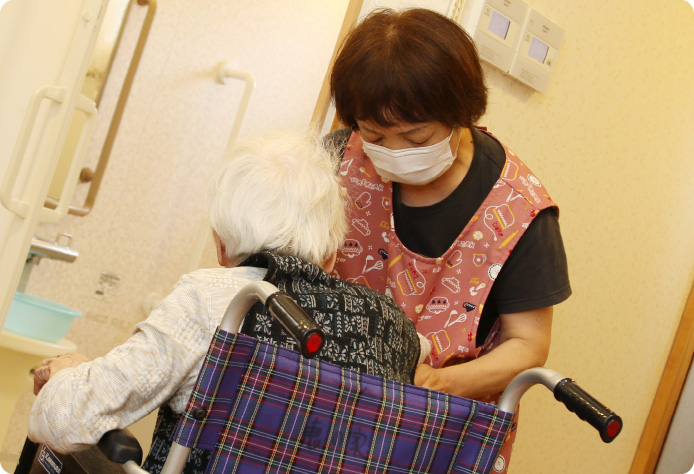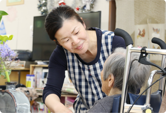 介護というと、一方的に「お世話をする」というイメージがあるかもしれません。しかし、いつまでも元気でいてほしいからこそ、利用者さん自身ができるところは見守って自立を促すようにしています。昨日までできなかったことが、できた瞬間は、とても嬉しいですね。利用者さんのパートナーでありたい、そう思っています。