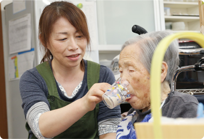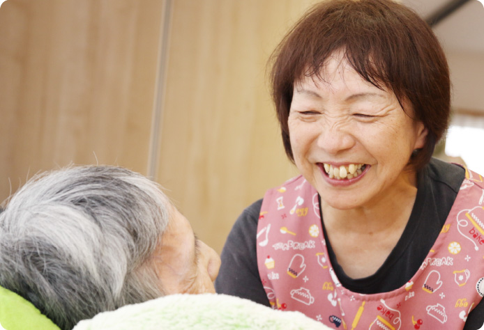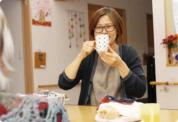 小規模多機能居宅の業務を担当しているので、文字どおり仕事内容は多岐にわたり、常に臨機応変な対応力を求められます。一方で、利用者さんの横に座って、ゆっくり会話を楽しみながら一緒にお茶を飲む、そんなゆったりと時間に身をまかせる仕事も。どの仕事も、その人の一日を素晴らしいものにすることが目的です。