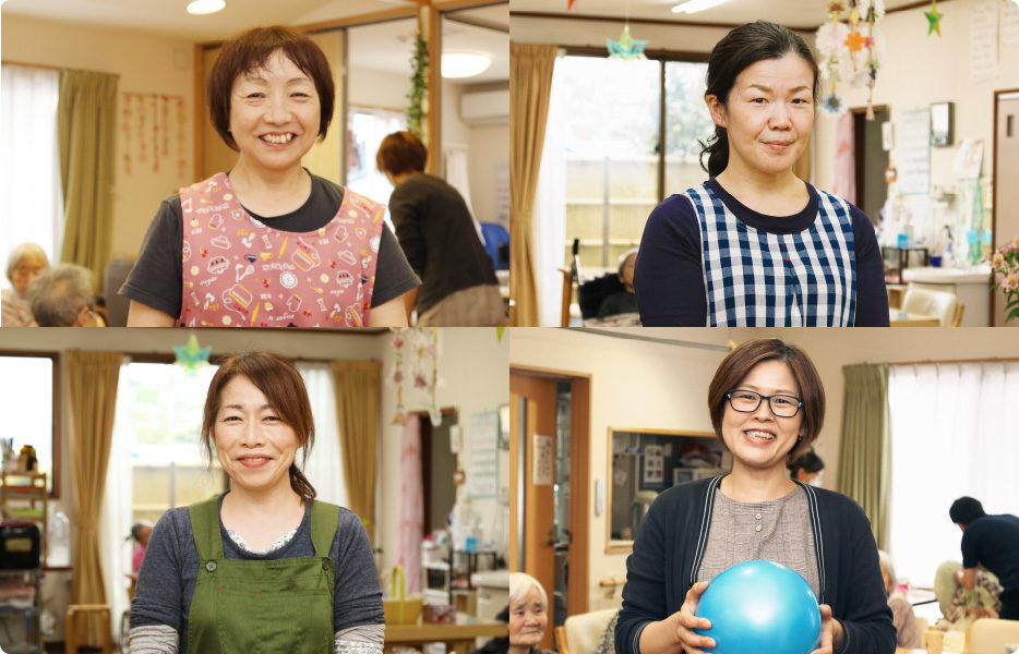 グループホームで、利用者さんの生活全般をサポートしています。ここでは時間に追われることなく、じっくりと時間をかけ、一人ひとりに合ったサポートをすることができています。だから、ちょっとした変化もすぐ気付けるんですね。理想の介護に取り組めている楽しさで、あっという間に10年以上が過ぎてしまいました。